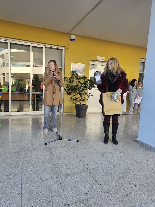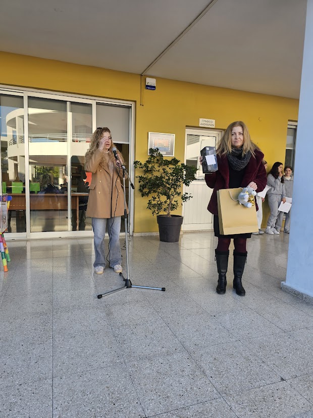 Η υπεύθυνη εκπαιδευτικός του προγράμματος CLIL στο σχολείο μας, Χρύσω Ιωάννου, παρέδωσε στο Κεντρικό Μαθητικό Συμβούλιο τη χρυσή διάκριση, καθώς και τα δώρα που τη συνόδευαν.